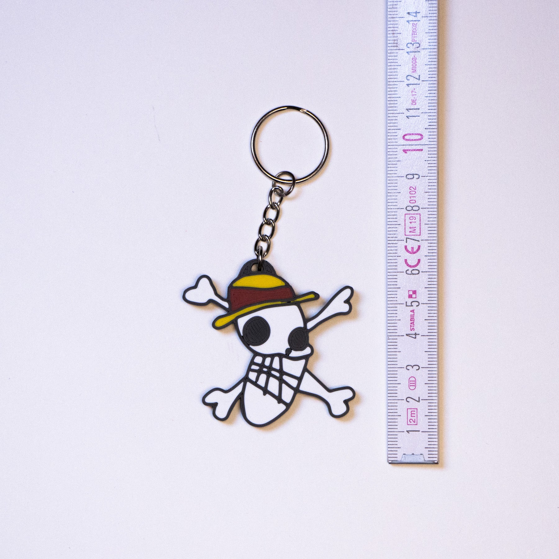 High quality double-sided 3D printed Key Chain. Depicting the iconic self drawn Flag by Ruffy - Monkey D. Luffy from One Piece, suspended on a chain