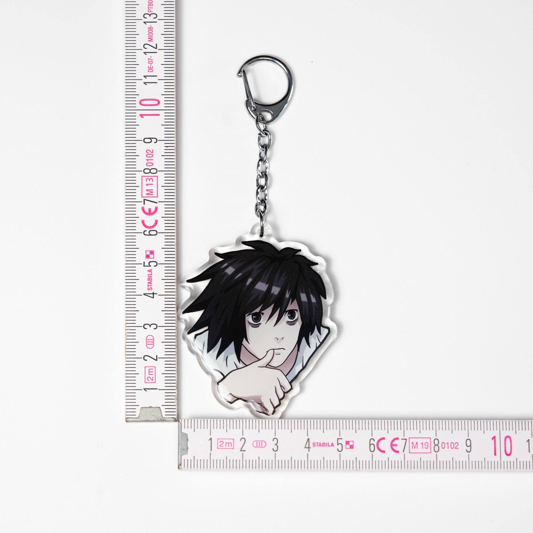 High quality double-sided acrylic keychain. Front side sealed with epoxy. The smartass detective, called L, suspended on a chain with carabine hook.